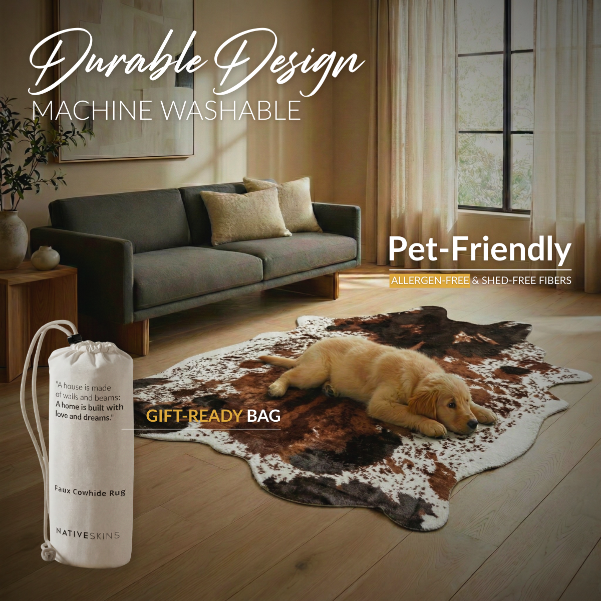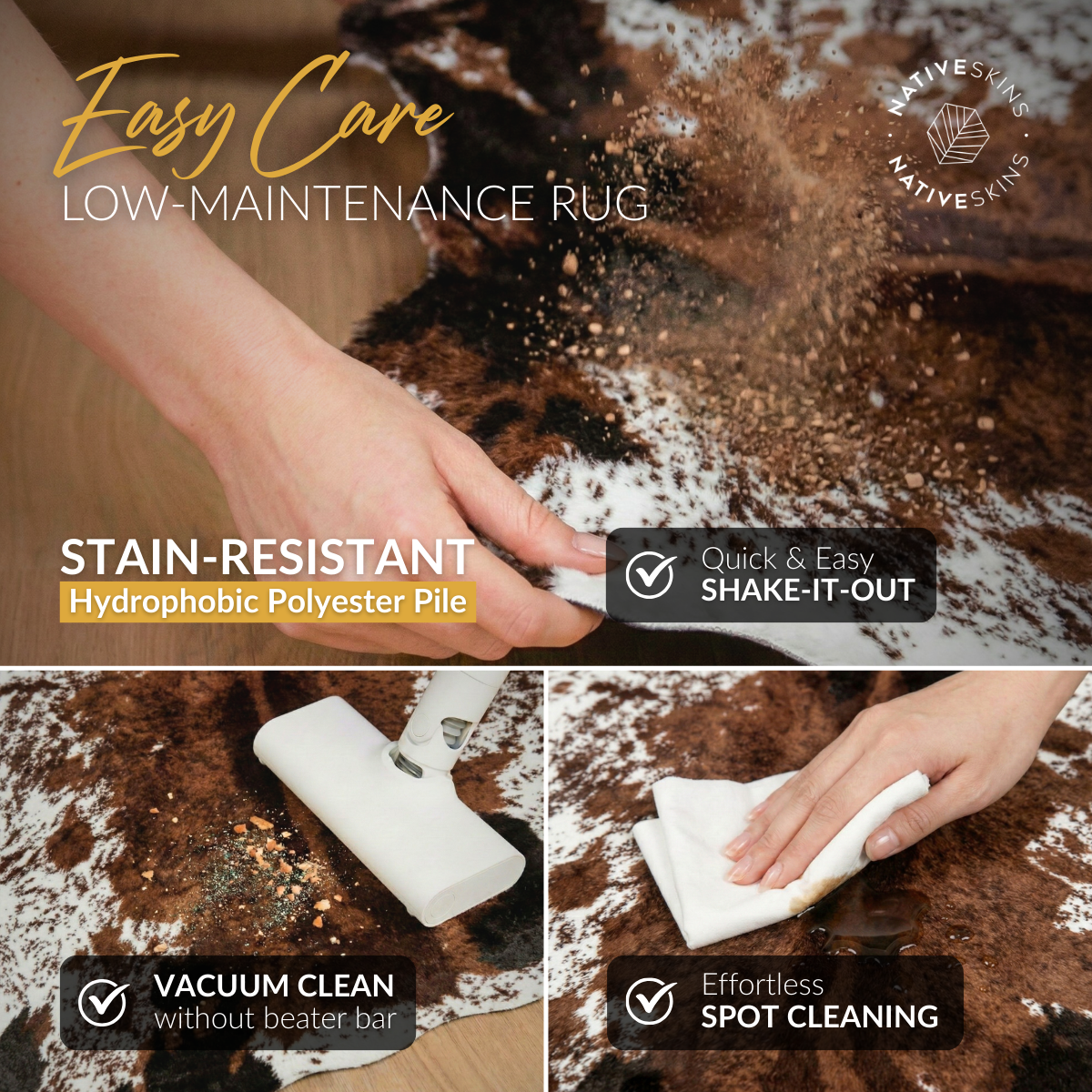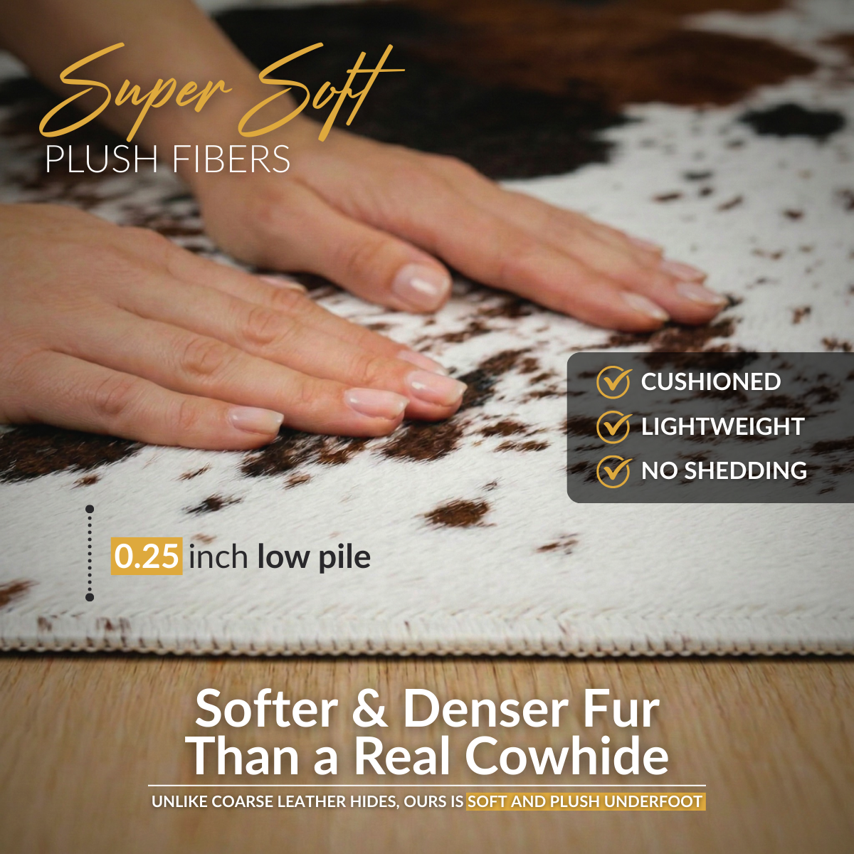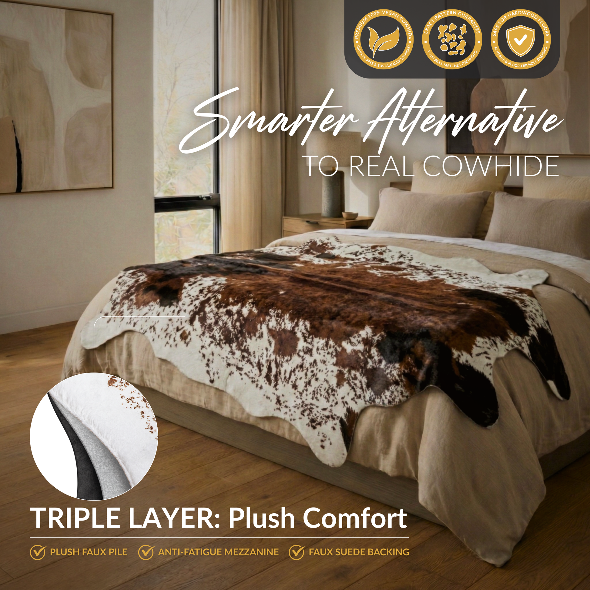 Premium materials with an invisible locking edge design; The faux cowhide rug from NativeSkins was designed not only to last but to look and feel great with unmatched softness.
