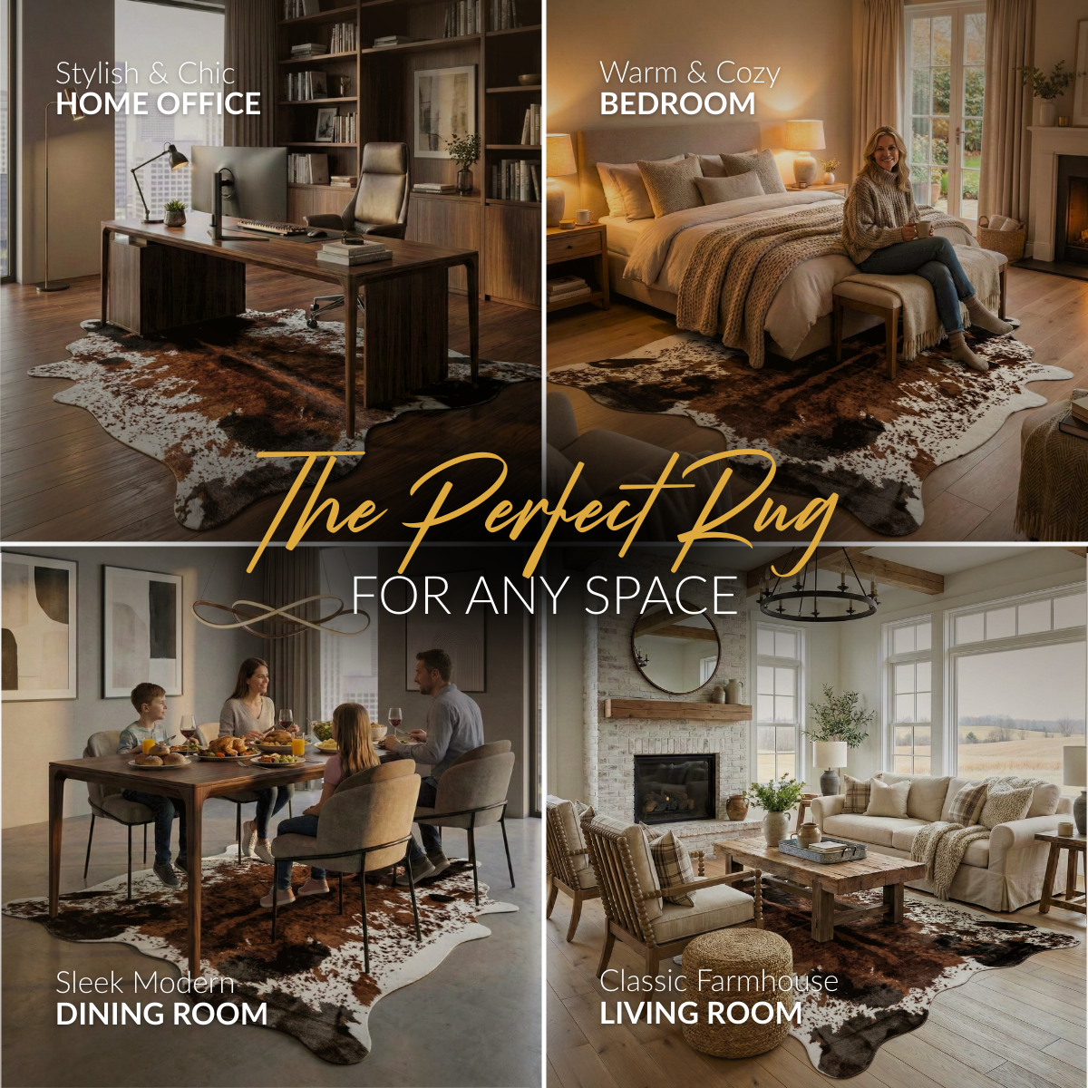 This versatile in shape and true-to-color cow print rug stands out in any setting, giving your room a dash of refined bohemian/western flair.