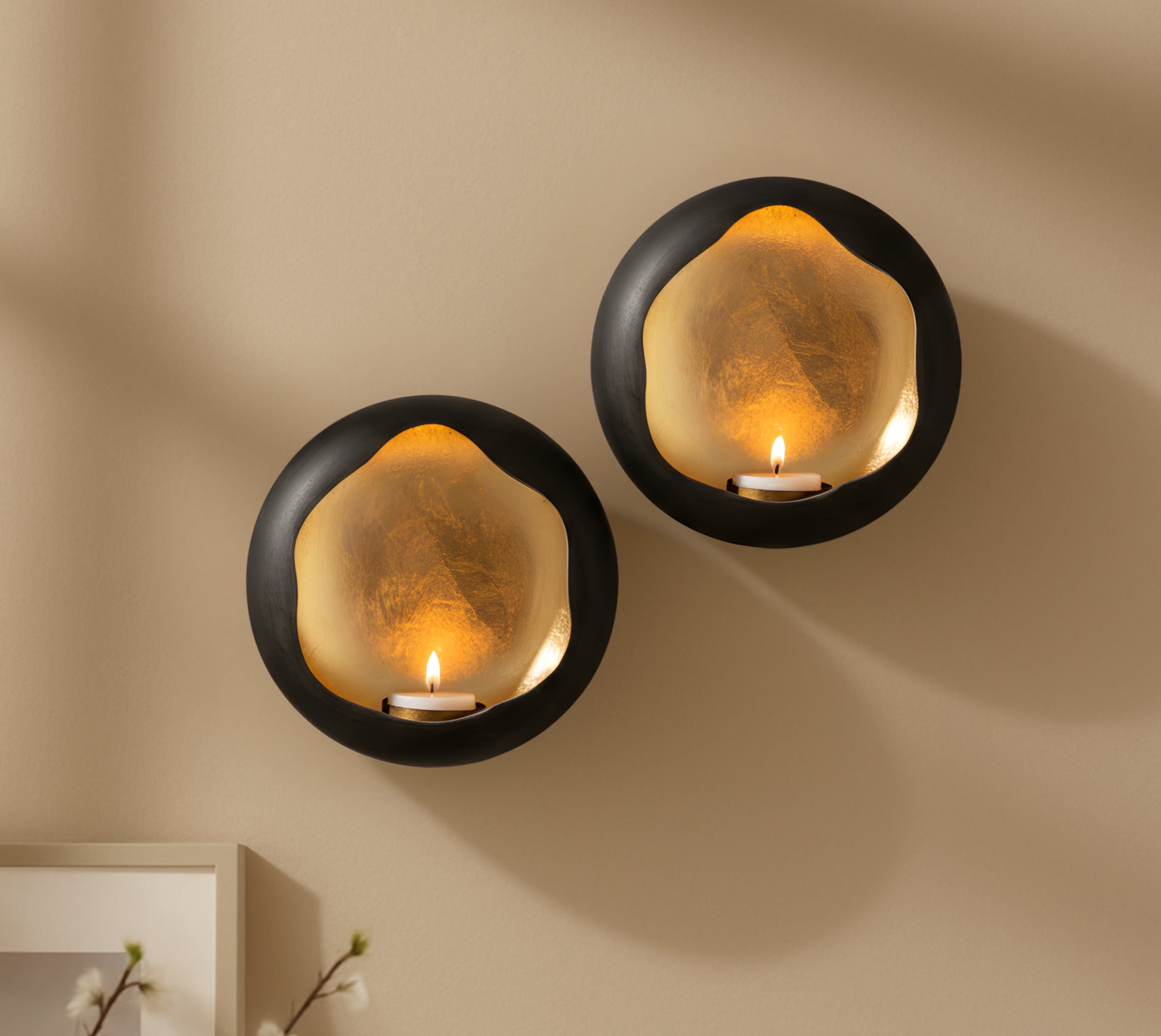 Enhance the Mood with Ambient Warmth: The Solara wall candle holder set includes two sconces, designed to hold tea light candles that emit subtle, inviting candlelight. Bask in the cozy ambiance they effortlessly create, perfect for cozy evenings or setting a relaxing atmosphere in any room.